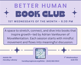 Let's gather to read books that help us be our best selves! Introducing the Better Human Book Club, a partnership between the Handley Library branch and MoveMentation. Our focus is on books that help us to know ourselves and allow us to explore personal and communal growth together.